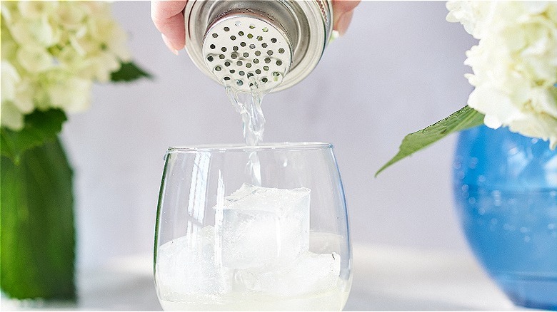 Because it's technically a highball, you can serve in a tall highball glass, but any standard glass will do here (you could even serve in a wine glass, á la Hugo spritz). To ensure the ice and cucumber fragments don't slide into your drink, strain the mixture into the glass using any strainer. While a fine strainer is never a bad idea, you actually won't need it here, and can instead use a Hawthorne strainer or the built-in strainer on your shaker lid.