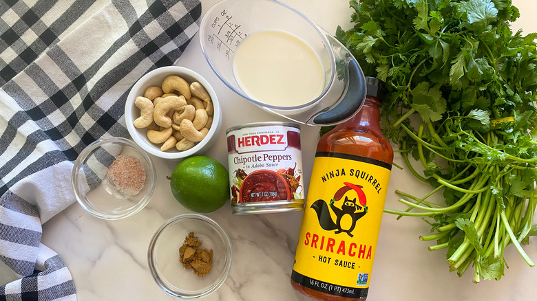 - Add the drained cashews, cilantro, chipotle peppers with sauce, soy milk, cumin, salt, lime juice, and sriracha to a blender. Blend until smooth.