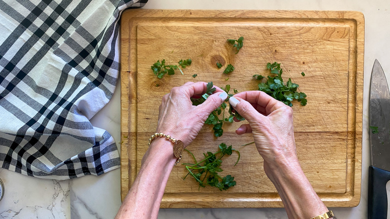 For this recipe we want to use cilantro leaves and only the tender small stems. So go ahead and strip some leaves off of the stems so that you have a tablespoon. Then scoop out 3 of the chipotle peppers from the can and add in 1 teaspoon of the sauce that they are packed in. "The chipotle peppers do add quite a bit of heat so if you want to tame the mayo down, you can reduce to one or two peppers," Hahn explains. "Also, since you won't be using the whole can, I usually transfer the remaining peppers to a small container with an airtight lid and stick it in my freezer for the next time I only need a few peppers for another recipe," Hahn goes on to say.