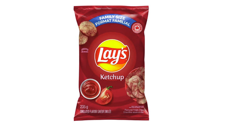 Ketchup chips are quintessentially Canadian food you simply need to try in order to understand for yourself. The Lay's rendition showcases a beige chip speckled with red, evoking the flavor of potato fries generously drizzled with ketchup. There's an underlying sweetness, but also a refreshing burst of flavor from the tomato-forward flavor. Arguably, no chip pairs better with burgers and hot dogs at a cookout than Lay's Ketchup flavor. This uniquely Canadian snack, also popular outside North America in places like the United Kingdom, offers an intriguing blend of savory and sweet, perfect for those in search of a distinct culinary adventure.