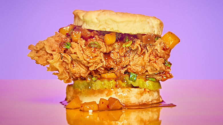 As June approaches and we sashay into Pride Month, David Chang's Fuku announced via press release that it's not only debuting a new chicken sando, but also continuing its support of the Hetrick-Martin Institute (HMI), an organization that has provided support and resources for LGBTQIA+ youth since 1979. Proceeds from the sale of the new Sashay Filet Biscuit during the month of June will be donated to HMI, marking the third year that Fuku has partnered with the organization. The Pride Sandos featured in 2021 and 2022 were stacked high with chicken fingers and topped with ranch and rainbow slaw, but this year's Pride offering is a spicy departure with a southern flourish.
