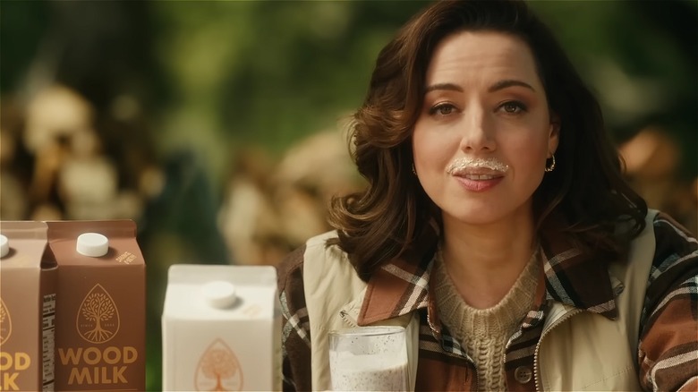 You know oat milk and hemp milk — now, meet Wood Milk. If you haven't heard of it before, "Wood Milk" has been the subject of an ad campaign starring celebrity actress Aubrey Plaza, first airing on April 20. It has an official Instagram account, and you can even order a witty graphic tee shirt on the Wood Milk website for $20. You cannot, however, purchase any actual milk. Why? Because Wood Milk doesn't exist. It's a spoof product created by the National Fluid Milk Processor Promotion Program, aka MilkPEP. In the ads, Plaza's fictional company "Wood Milk" is peddling milk made out of trees. According to the Physicians Committee for Responsible Medicine (PCRM), it's a jab at plant milk brands, going so far as using the milk-mustache symbol of the "Got Milk?" ads of the late-90s to early-2000s.