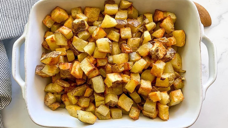This is one of the simplest breakfast foods you can make. Just parboil the cubed potatoes for a few minutes, without removing the skins, then fry them on the stovetop in some seasoned salt and olive oil for up to 10 minutes, stirring frequently, until crispy on the outside. Serve them up right away with sides of your choice, but remember that if you're setting them aside for another day, the best thing is to heat them in the oven or air fryer. A microwave might yield soggy results.