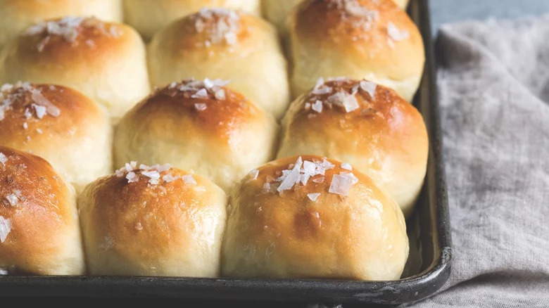 To prepare this feat of culinary magic, boil and mash your potatoes, preserving a bit of your cooking water. Then mix these two ingredients with yeast, sugar, flour, softened butter, salt, lemon juice, and eggs. From then on, treat your concoction like regular bread dough and knead it, let it rise a couple of times, and bake it in rolls at 350 degrees Fahrenheit for about 30 minutes. After brushing them with butter and topping them with sea salt flakes, you can serve your potato rolls with any of the main breakfast staples. They're especially good for scraping up the gooey yolk of a sunny-side-up egg.