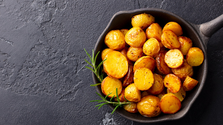 For chef Maxine Siu's version, heat some olive oil in a skillet, sauté your chopped yellow onions until caramelized, then parboil your potatoes, smash them up, and roast them in the oven for up to 20 minutes. Then simply combine the potatoes with thyme, rosemary, and your caramelized onions. Another great option for skillet potatoes is to thinly slice your potatoes, with or without the skins, fry them in an oiled skillet with salt, pepper, and mixed herbs, and once they're golden brown, add garlic powder and butter. And you don't even have to parboil the potatoes first! Easy peasy.