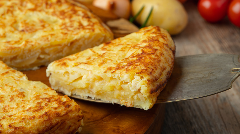 This typical Spanish treat may look like a simple omelet or quiche, but the leading ingredients are potatoes, olive oil, and onions, with eggs taking a back seat to the operation. Prepare a Spanish omelet or tortilla española by frying the potatoes, onions, and some garlic in a pan with plenty of olive oil. Once the items are cooked through, but not yet browned, mix them thoroughly with beaten eggs. Pour the entire mixture into a pan and let it cook until the bottom is set but the top is still wet. Using a heatproof plate, flip the tortilla in its entirety, then cook the other side until browned. The result should be a potato tortilla that is golden on the outside and creamy on the inside.