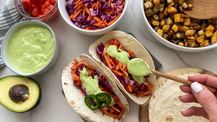 Tacos are a weekly occurrence in most people's homes — and it's usually on Tuesday! Why do we love tacos so much that we've given it a day in our weeknight dinner line up? There are lots of things to love about tacos. They're so easy to customize based on your diet preferences, they are full of flavor, and they are quick to make! Wellness coach and recipe developer Miriam Hahn brings us this recipe and says, "We eat lots of Mexican food in my household, and I love getting creative with the fillings and toppings for tacos and burritos. If you haven't cooked with rutabaga before, this recipe may convince you to add it to your weekly produce haul. Rutabagas are part of the cruciferous family and have lots of health benefits. They're similar to turnips but when they are roasted, they taste like crispy potatoes. When paired with the eggplant that is softer in texture, you end up with a delicious base for tacos." You're going to love this amazing dinner complete with a delicious slaw and cilantro lime crema.