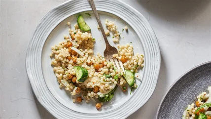 Israeli couscous is a vastly underrated grain that has a similar texture to rice but a more versatile application like pasta. It's fairly quick cooking and can even be served plain, if that's your jam (sometimes it's nice to keep it simple). It's more dense than regular couscous, making it easy to dress up and fill with herbs and veggies for an excellent side dish. In this recipe shared by developer Michelle McGlinn, Israeli couscous is dressed in olive oil, lemon, mint, and parsley, then tossed with cucumber, chickpeas, and onion for a refreshing crunch. You could even eat this as a main course because of how filling it is. Ready to swap out the rice for a seriously good side? We have the recipe for you.