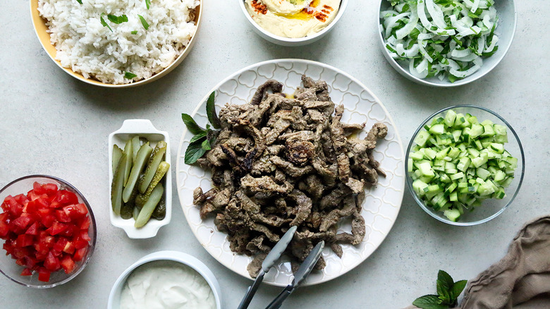 You may want to try this Middle Eastern-spiced beef shawarma bowl recipe when you're looking to switch out your standard burrito bowl for a new set of flavors (but with the same general idea). "This beef shawarma is ideal for feeding a family," says recipe developer Ashley Altan of Crave-Worthy. "The cut of beef is inexpensive and tasty, and once cooked, it can be eaten in a variety of ways, including stuffing it into a pita pocket, rolling it into a tortilla, or even serving it over a bowl of buttered rice with toppings like hummus, sliced tomatoes, and cucumbers." And this last iteration is precisely what you get when you serve beef shawarma in its bowl-like form — a well-balanced, flavor-packed mix of veggies, grains, and meats.