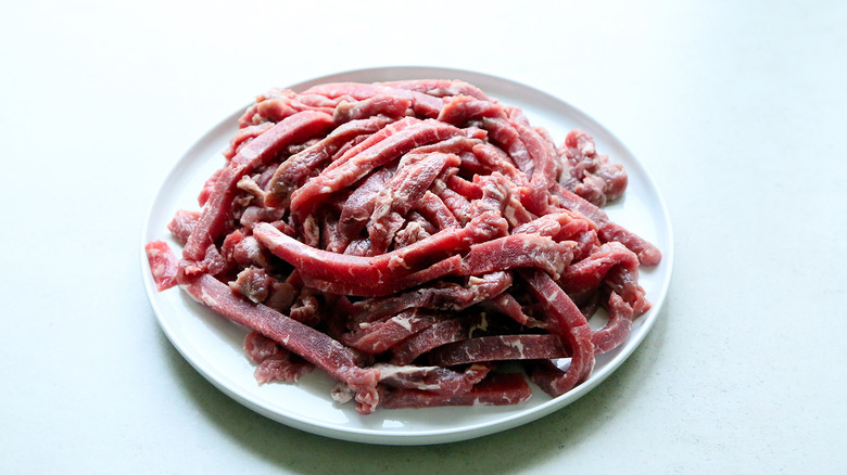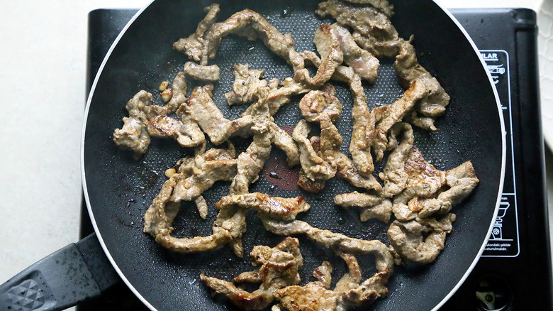 When the beef is ready to go, place a large skillet on the stove and turn the heat to high. Add the beef strips to the skillet, spreading them out so they're not layered on top of each other (you may need to cook the beef in batches if your skillet isn't large enough). You want the beef to attain a nice char, so cook the meat for about 10 to 15 minutes, until it's golden-brown.
