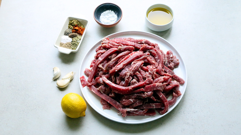 - For the beef marinade, add the olive oil, juice of 1 lemon, 3 cloves of garlic, spices, salt, pepper, and baking soda to a mixing bowl. Mix until fully combined.