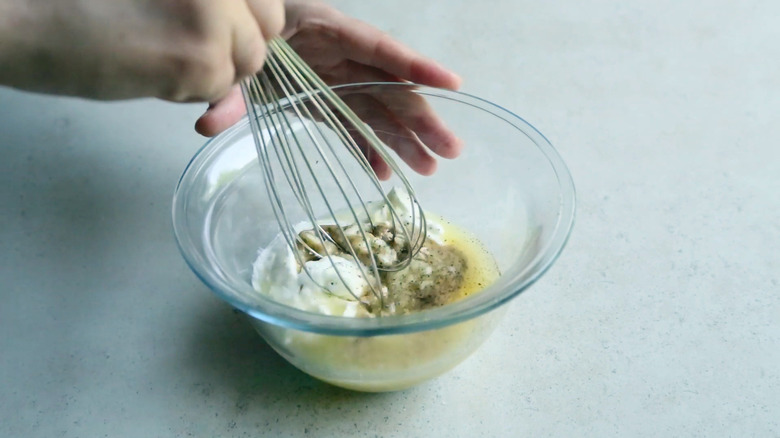 Then, mix the tahini yogurt sauce by placing the yogurt, tahini, lemon juice, and garlic in a small bowl. Use a whisk to stir the ingredients until they're well-combined.