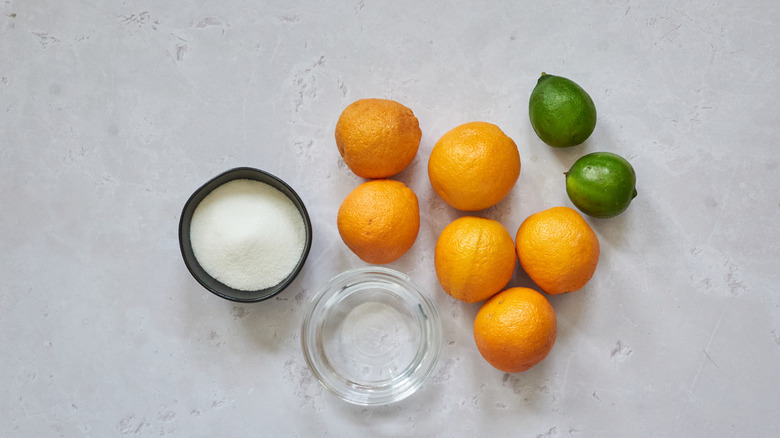 To make this mix, you will only need 4 ingredients, or 3 if you don't count water. The ingredients that don't come out of your tap include granulated sugar, blood oranges, and limes. If you can't find blood oranges where you shop, you can use whatever oranges are on offer, although blood oranges do tend to be sweeter than other varieties. McGlinn also notes, "Blood oranges may also be sweeter if more ripe," so if you want a really sweet syrup, you may want to hold out for these.