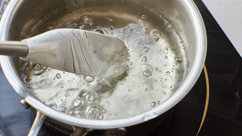 - Bring the water and sugar to a simmer and stir the mixture for about 1 minute until the sugar is completely dissolved.