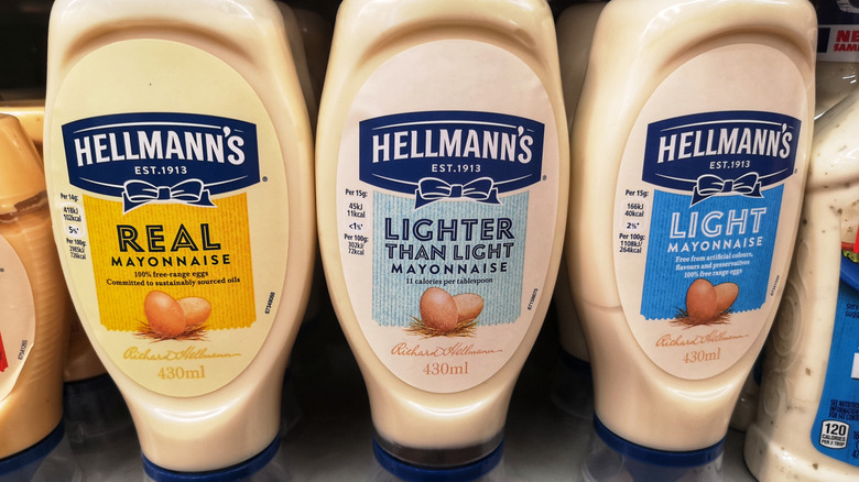 Now that you know how much mayonnaise you should be adding, what about the best type of mayonnaise to use? Like most things, it's up to preference: Duke's mayonnaise, Hellmann's, and even Kewpie can all work well for a creamy eggy mixture. The more important element to consider is the fat content of the condiment you've chosen. If you want to avoid a runny egg salad, you should opt for full-fat mayonnaise over low-fat since the latter has more water, making it more prone to splitting or becoming soggy as it sits in the fridge. So if you're trying to cut down on fat, you may sacrifice a bit of flavor and texture.