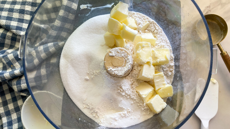 - Put 2 cups flour, ½ cup sugar, and ½ cup cubed butter into a large food processor. Process for 2 minutes until it is blended and crumbly. Reserve 1 cup of this mixture for the topping. Spread the rest into a 9-inch baking dish that has been sprayed with cooking spray and press to form the crust.