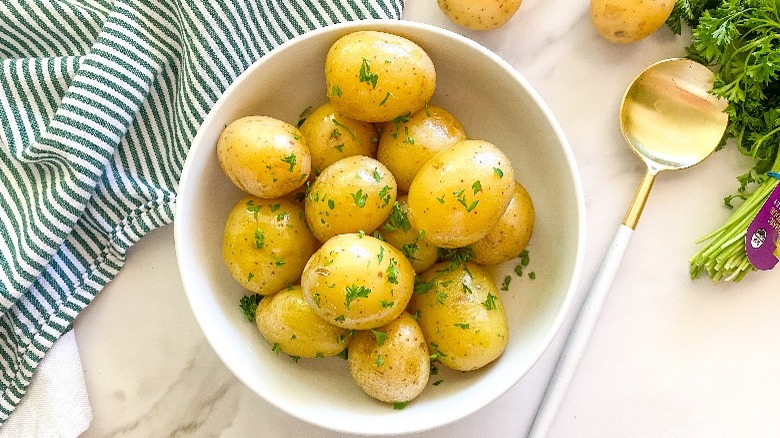 To make this recipe, we of course need some potatoes. "You're looking for small Yukon gold potatoes, and I find them usually packaged in a mesh bag. If you are hand selecting them from a bin, just make sure to choose potatoes that are all in the same size range," Hahn explains. Then we'll need some water (Hahn suggests filtered), sea salt, and butter. "I like using a very coarse salt here and you can use regular or dairy-free butter," Hahn goes on to say. The potatoes finish off nicely with some fresh herbs so pick up some parsley if you want to add a pretty finishing touch.