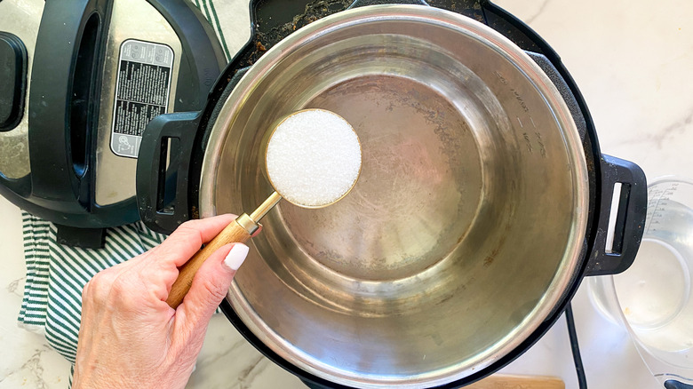 - Put the water and salt into the Instant Pot. Select the sauté button and stir for 2 minutes to dissolve the salt.