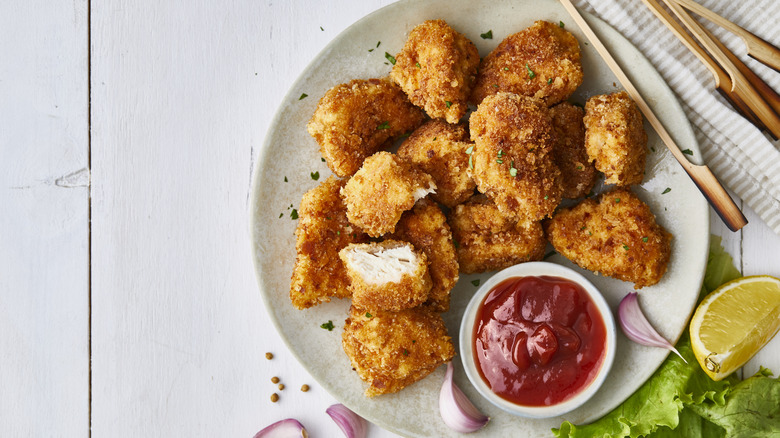 A feeding therapist shared with Thrive Little the answer is not that complicated. Kids love to eat with their hands, and chicken nuggets are one of the easiest on-the-go handheld foods you can find. But the food therapist also contends that because they are so highly processed, chicken nuggets are easy to chew and don't cause texture issues for young palates that might be sensitive to such things. These little pieces of fried perfection also do not give off a strong smell nor offer a lot of competing flavors when you sink your teeth into them — which is also appealing to young kids.