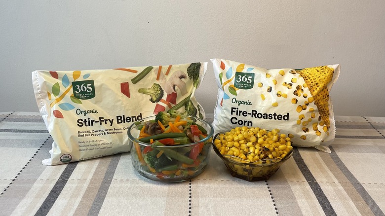 At roughly $3 per bag, we expected great things from 365, the store brand of health food giant Whole Foods Market. Our local Whole Foods Market seemed a tad empty in 365's section of the frozen aisle, however, leaving us with limited options for our taste test. After some contemplation, we settled on its stir-fry blend and fire-roasted corn — an unusual offering in the frozen vegetable sphere.