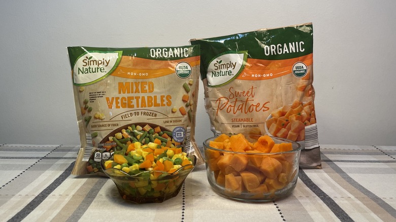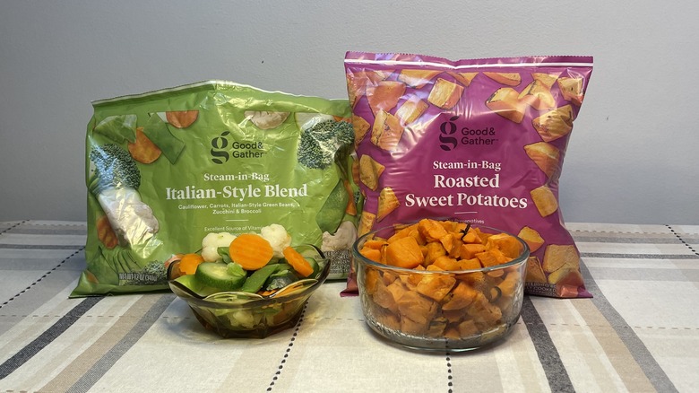 Interestingly, Good & Gather provided us with some of the best — and worst — vegetables of all. The sweet potatoes were some of the most memorable frozen veggies on our list, thanks to their smooth, creamy flesh and deliciously chewy bite. Even though we opted to steam them, they had a pleasantly parched exterior resembling that of cubed, baked potatoes. In a stunning upset, however, Good & Gather's Italian Style Blend contained a variety of truly terrible produce. From the rubbery carrots to the woody broccoli, there wasn't much to like about this mix. Worst of all was the zucchini, which had an intensely bitter quality and equally grim texture. Still, thanks to its reputation — and outstanding tubers — Good & Gather snagged a slightly higher-than-average score.