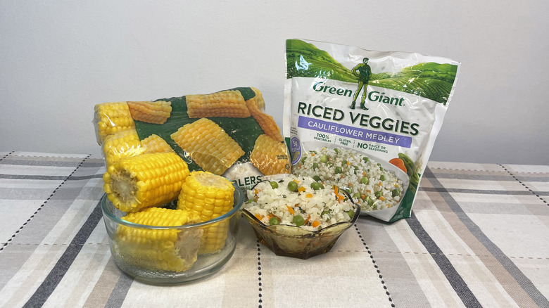 To keep our testing methods consistent, we needed to source plain frozen vegetables from Green Giant, which presented a challenge. These days, the bulk of Green Giant's frozen veggies are spiced and sauced to perfection to appeal to consumer palettes. After a lengthy search, we obtained the adorably compact "Nibblers" corn cobs and a riced cauliflower medley.