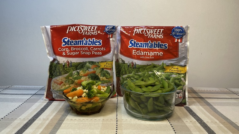 Hailing from Bells, Tennessee, PictSweet Farms boasts a broad range of products in its frozen vegetable line. Recently, it's even added an assortment of seasoned vegetables for the air fryer, like Mexican Street Corn. For our taste test, we picked up two unflavored options: Steam'ables Corn, Broccoli, Carrots and Sugar Snap Peas and Steam'ables Edamame in the pod.