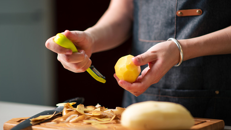 After cutting, immediately transfer the potato pieces to water or broth to prevent browning or cook them right away. A cutting board provides an ideal workstation when preparing potatoes, but cut pieces deteriorate quickly when exposed to air. To prolong the life of your cutting board, use one side for cutting vegetables (like potatoes) and the other side for handling raw meats. This can also help to prevent cross-contamination.
