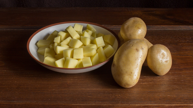 Once cut, sliced or diced potatoes will oxidize, which causes them to brown or turn gray when exposed to air. This phenomenon occurs when the phenols and enzymes in the potato's cell walls are exposed to oxygen, causing a chemical reaction that turns cut potatoes pink. Using a dull potato peeler or knife can exacerbate this effect by damaging more of the potato's cell walls. Although this discoloration is harmless, it can be prevented by submerging cut potatoes in cold water, creating a barrier against oxygen and maintaining their color. If potatoes have already turned pink, their color can be restored using ascorbic acid or vitamin C powder, vinegar, or lemon juice. This adjusts the pH level, returning the potatoes to their original color.