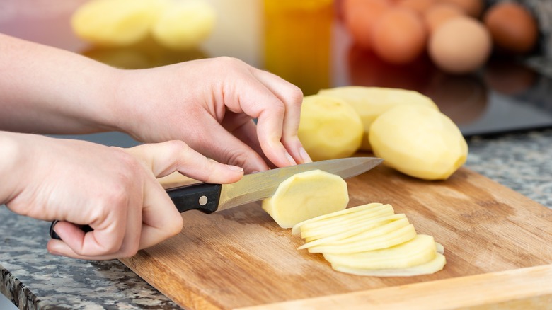 Pull the knife from front to back while cutting to prevent potatoes from sticking to the blade