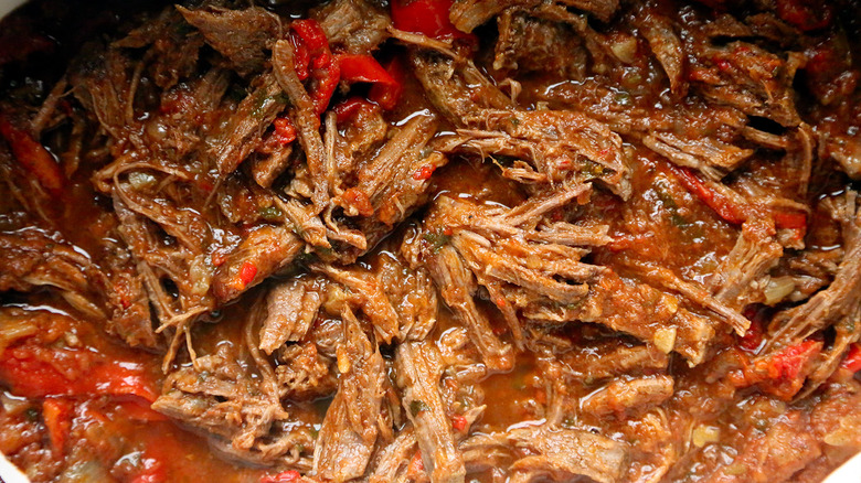 Altan also explains the name of the dish, and if you're familiar with it or speak Spanish, then you'll recognize that it's quite an apt title. "Ropa Vieja is Spanish for 'old clothes,' and it's slow-cooked beef in a tomato sauce (some people use already cooked meat)," she explains, adding that "It's usually served with rice and plantains or black beans on the side." This recipe is no different, featuring heaps of meat piled high onto a bed of rice — for old clothes, this dish sure dresses up pretty well.