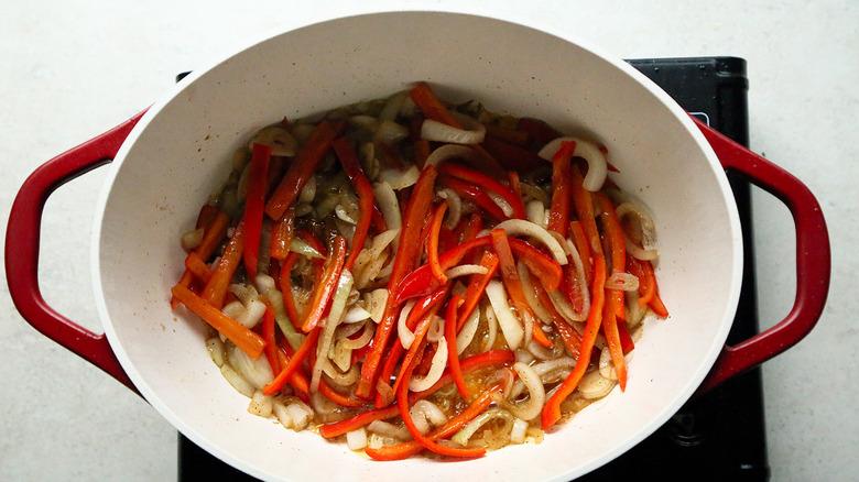 - Next, remove the meat and add the thinly sliced onion, peppers, chopped garlic, and the raining half of the salt and pepper. Stir-fry until the onions have softened, about 5 minutes.