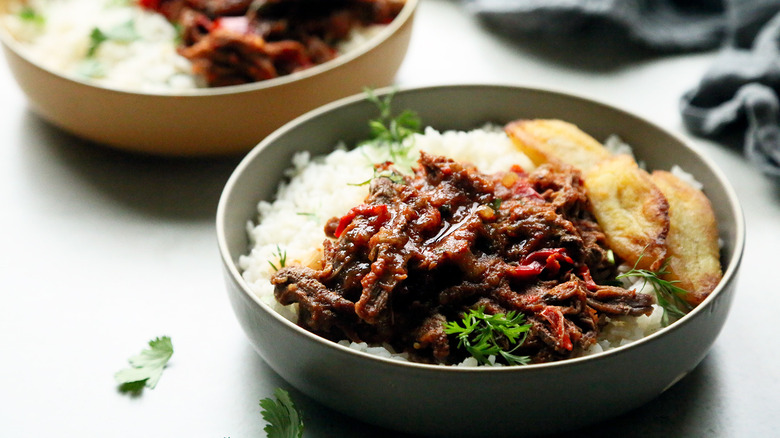As Altan mentioned, rice is the ideal accompaniment for ropa vieja, so fill up a bowl with white rice before piling on some of that meaty goodness. You may also choose to serve the meat with black beans or perhaps some fried plantains — or maybe you'll serve it with all of the above, just be sure to sprinkle on plenty of cilantro to top it all off.