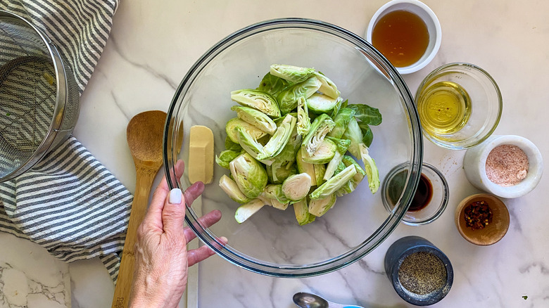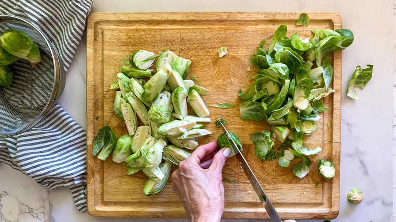 Wash the Brussels sprouts and cut off the rough stem. Then remove the outer leaves that become loose and cut each sprout in half or in quarters if you have Brussels sprouts on the larger size. As you cut them, toss them into a large mixing bowl. "If you are short on time, some stores offer Brussels sprouts that are already trimmed and cut, making this side dish even more convenient for weeknights," Hahn remarks.