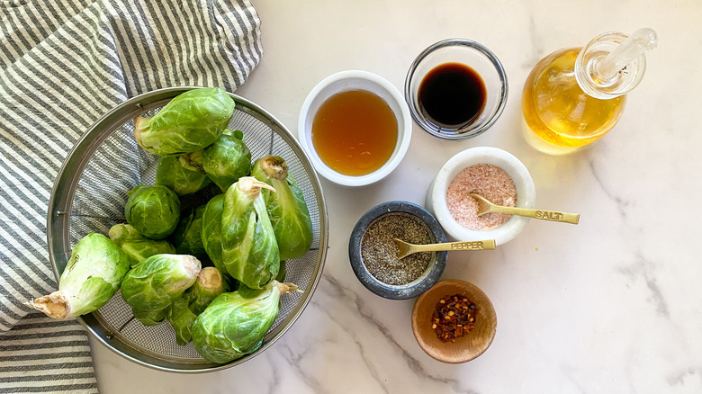 Gather the ingredients for honey-balsamic air fryer Brussels sprouts
