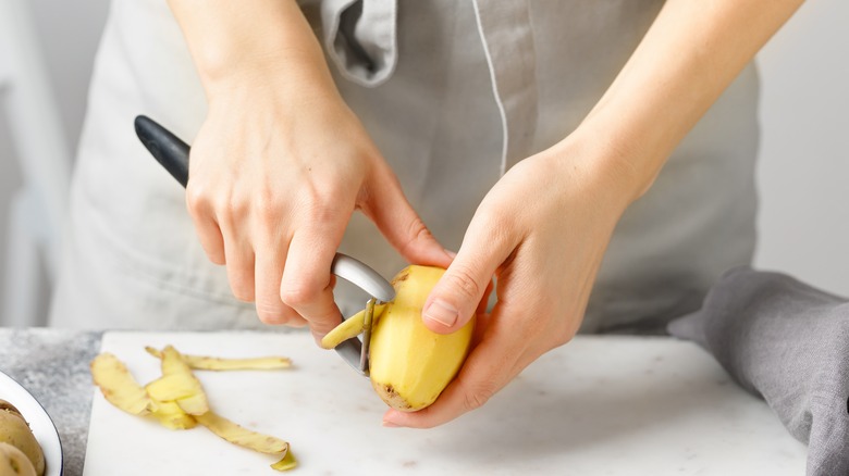 The thing about these beloved starchy vegetables is that they need a little extra love and care compared to other vegetables found in the garden. Towards the end of the harvest season, as gardeners delight in digging potatoes up like they are made of gold, you can't help but notice the embedded dirt within tiny dips and gaps on the exterior. Dirt, pesticides, and bacteria love spending quality time on the skin of a potato, which can all be unsafe to ingest. For that reason, washing potatoes is imperative. Even after they have been scrubbed clean, some recipes instruct you to peel the skin too. But the painstaking task doesn't have to be a burden. In fact, there are so many peeling hacks that peeling potatoes can be fun. So grab your sack of Yukon golds and let's get to peeling.