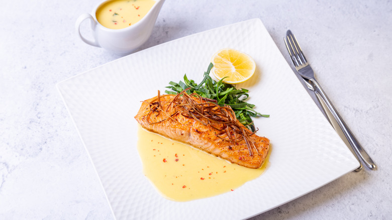 Most classically, the sauce shines atop a white fish like cod, pike, or bass, although salmon works too. The sauce's savory note accentuates other seafood too, like scallops or shrimp. And instead of using hollandaise over a plate of asparagus, spoon this sauce for a just as tasty alternative.