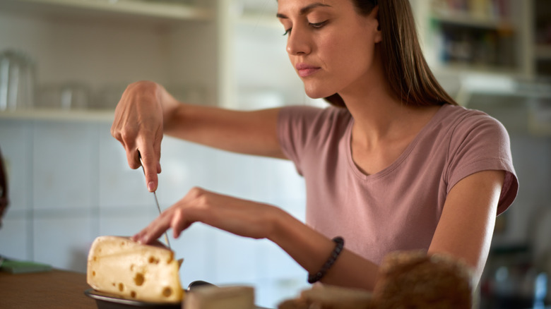 As we're all working to waste less of our food, there are a few tips to take that will keep you enjoying your dried cheeses for a little bit longer. The step you take will depend on exactly how dried out your cheese is. If the edges are uncomfortably crispy, they can be simply sliced off with a knife. But, if nearly the whole chunk is hardened, you can try making a recipe called fromage fort.