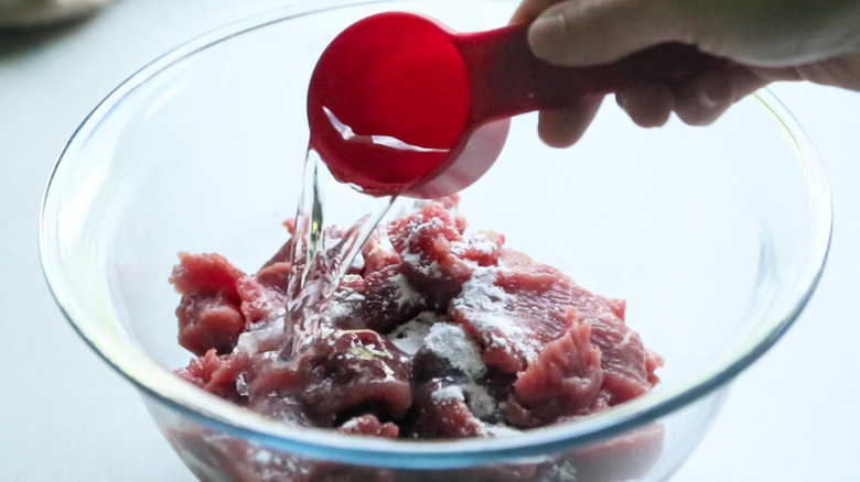 - In a bowl, mix the baking soda and about ¼ cup of water with the sliced meat until combined.