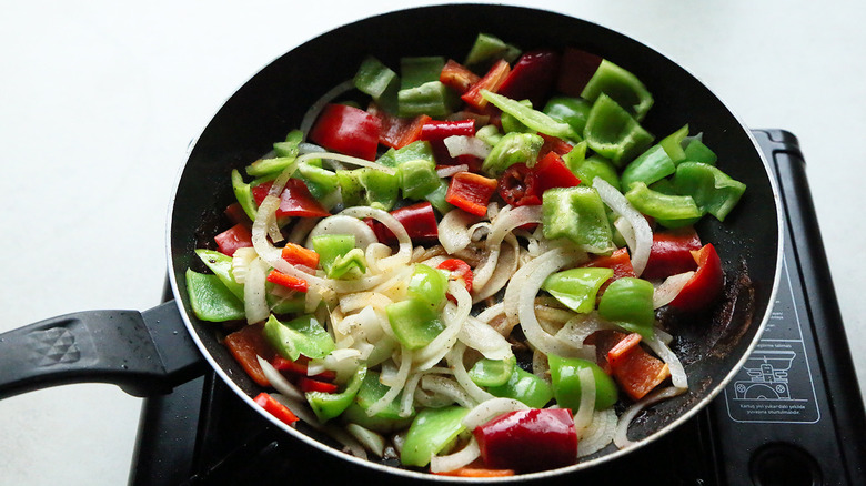 - Next, add the onion, red pepper, green pepper, and chile, and season with the remaining salt and pepper. Stir-fry for 3 to 5 minutes until the onions have softened.