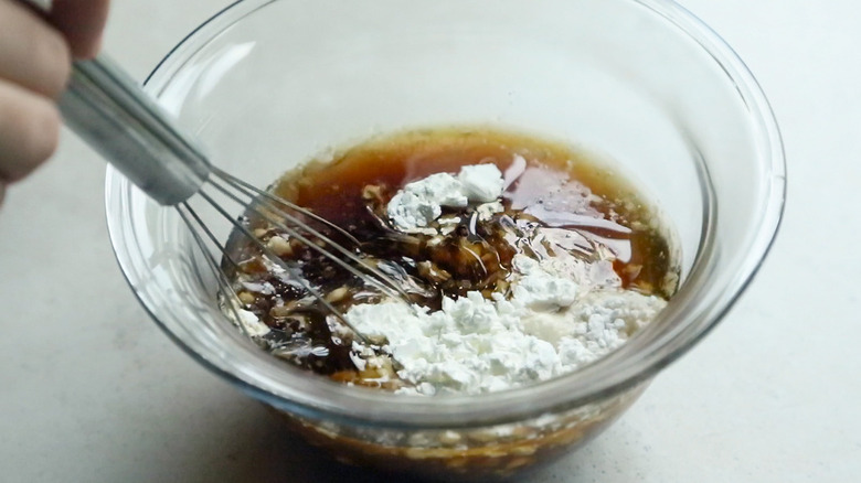 - Combine the soy sauce, beef broth, sesame oil, ginger, garlic, sugar, and cornstarch in a large bowl and mix until fully combined. Set it aside.