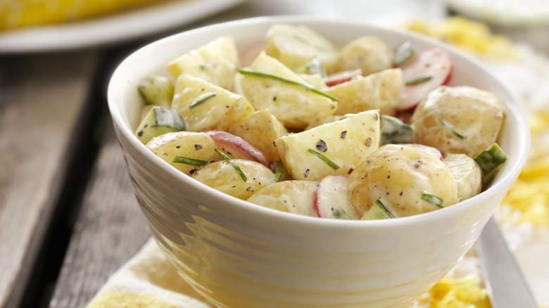 Start off with a solid potato salad recipe. It doesn't matter if it's a vinaigrette-forward French potato salad or a mayonnaise-rich Southern potato salad; any recipe will work with this pro tip. You'll make the recipe as called for, but when you go to drain your potatoes, place a measuring cup underneath the colander so that you can catch some of the starchy water. Once you start to pull together the dressing, add a splash or two of the starchy water to the mixture. Don't worry too much about the mixture appearing a little thinned out; it will set up once you chill your concoction in the fridge.