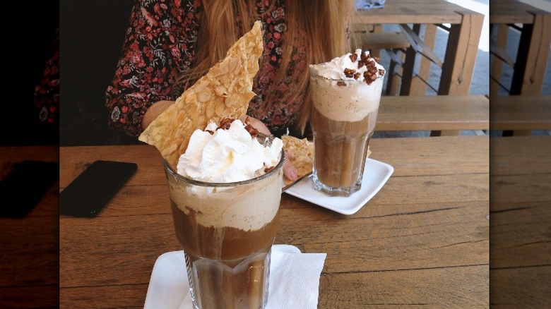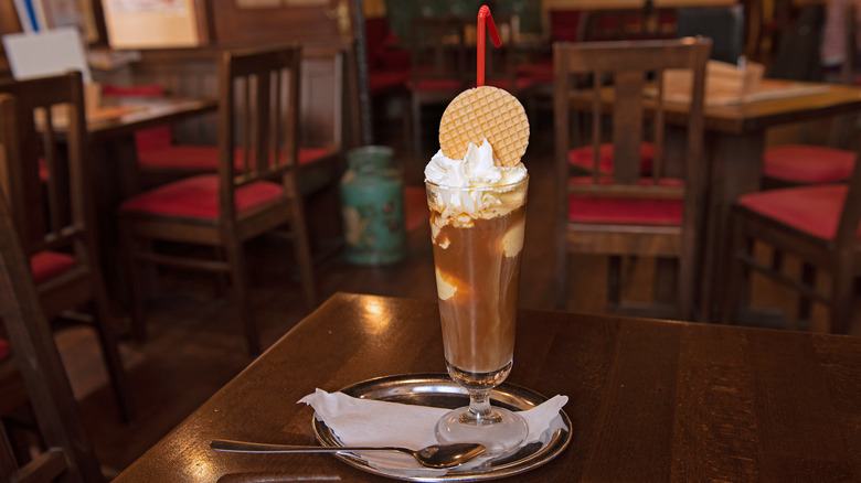 In Germany, the go-to summer favorite is eisakaffee. Crafted with a drip-brew, tasty vanilla ice cream, and whipped cream, it's a buzz-inducing cold drink that hits the spot. Contained in a large glass with both a spoon and straw, it's not meant for drinking on the go. Instead, it's served at cafes in pedestrian areas — a drink built to be savored while watching the world go by. Creamy, sweet, and still with a tinge of the coffee flavor, it almost hits the same notes as a milkshake. Plus, it can be topped with a variety of added treats, whether it's a cookie or some juicy in-season cherries. So how does this tasty drink come together? Let's dive into what gets mixed in.