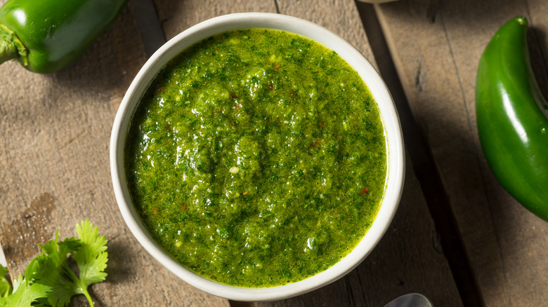 Much like its cilantro-based cousins, zhoug is wonderfully versatile. In Israel, it's a popular component of mezze platters, served alongside bites like falafel and pita. It can even add another layer to a dip, drizzled atop hummus for a zesty flair. And its herbal flavor is welcomed in a kebab — who doesn't want a bright, pungent hit atop grilled chicken?