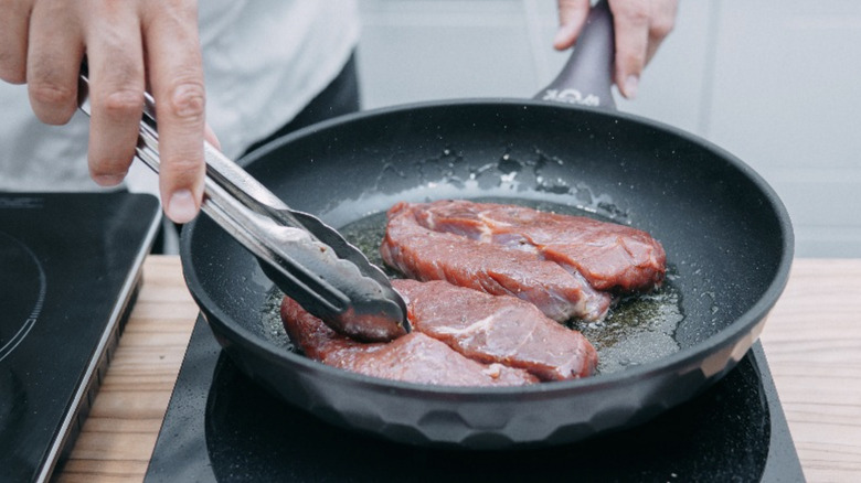 To prevent this, ensure your cuts of meat are well spaced out on the pan with roughly a 1-inch separation. And if your pan is too small, find a larger one or cook your meat in batches — after all, you're only looking for a few minutes on each side.