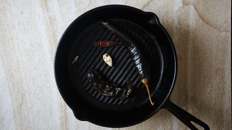 Preheat a gas grill or a cast-iron pan over medium-high heat. In a hot cast iron pan, briefly toast the chilies and garlic until they slightly blister, about 1 minute.