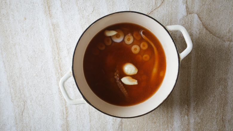 - Place the octopus in a large pot, ensuring it's completely submerged in water. Add 3 garlic cloves, smoked paprika, and red wine vinegar. Cover the pot and bring the water to a boil, letting the octopus simmer for 1 hour and 30 minutes.