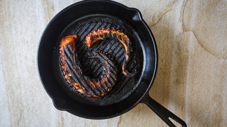 - Place the octopus pieces on the grill or grill pan. Grill for 5 minutes on one side, then flip and grill for another 5 minutes, until all sides are nicely charred.
