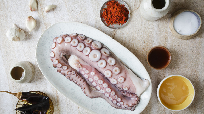 To prepare this unique recipe, gather the following ingredients: the tentacles of a cleaned octopus, divided into manageable pieces. You will also need garlic cloves, paprika or smoked paprika, and red wine vinegar.