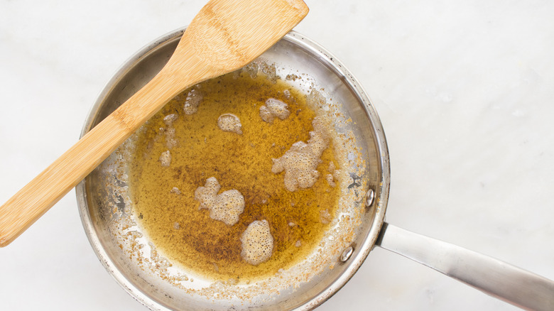 Continue to stir the butter in the pan with a spatula to ensure the milk solids don't stick and burn. Once the butter turns a hazelnut brown hue, remove it from the heat and immediately place it into a bowl. If you keep it on the heat any longer, the butter will burn.